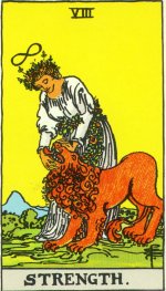 Strength denotes an inner power, mastery of will and development of inner might. Through mastering one?s emotions and learning from both success and failure the person Strength represents has reached a place where they are influential without applying physical force, able to weather the roughest of storms, and not likely to abandon the less fortunate. Strength also denotes a large capacity for forgiveness and compassion.